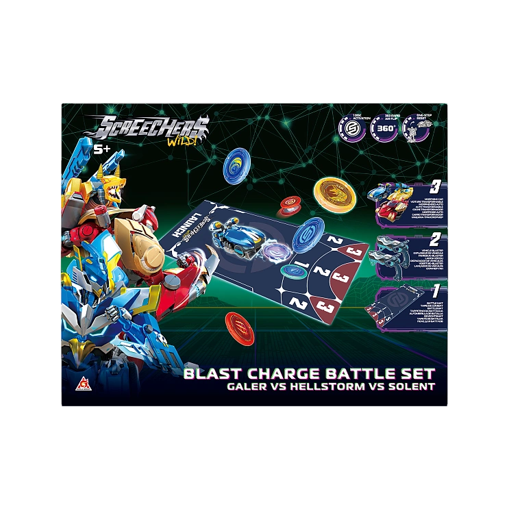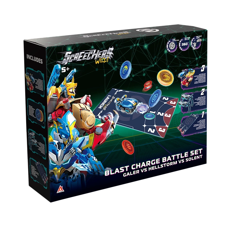 В набор входит: машинка-трансформер Геллер (14х12х10 см), машинка-трансформер Солент (10х6х13 см), машинка-трансформер Хэллшторм (14х8х10 см), 2 пусковые установки Скричер-Бластер, 9 энергетических дисков, двустороннее игровое поле, инструкция, наклейки. Набор упакован в закрытую коробку 44,5 х 11 х 35 см.